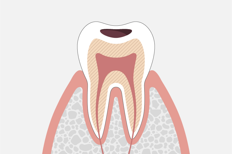 歯の表面のエナメル質が溶け始めた段階の虫歯です。痛みがなく、ついつい放っておきがちです。虫歯の部分だけを正確に治療し合成樹脂(レジン)を充填します。